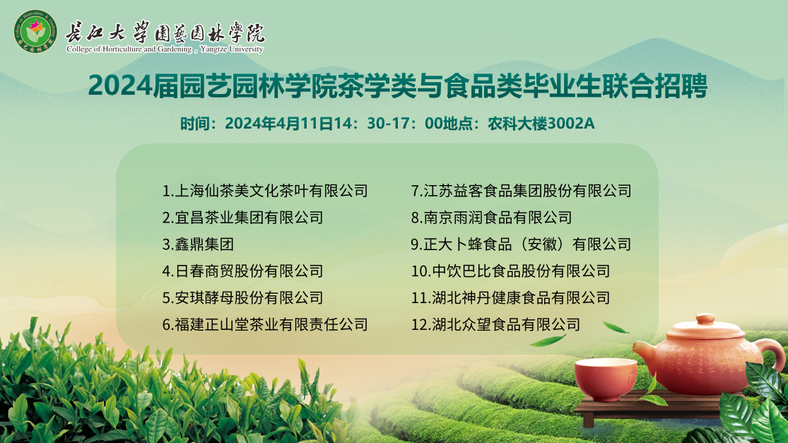 beats365茶学类与生命科学公司食品类2024届毕业生联合招聘会 2024年4月11日下午,beats365茶学类专业联合生命科学公司食品类专业,在农科大楼3002A教室举办了一场针对2024届毕业生的专场招聘会。届时,来自全国各地的数十家企业将汇聚一堂,为毕业生们提供多样化的就业机会及宽广的职业发展平台。本次招聘会特别邀请了十多家单位走进校园,直接面向毕业生提供就业岗位。在招聘会上,这十多家单位共提供了七十多个就业岗位,涵盖了茶叶生产、茶文化传媒、茶叶生产研究、食品生产、食品检测、食品营销和餐饮等多个就业领域,共计二十几个就业方向。 本届毕业生均具备参加招聘会的经验,在与各单位的交流过程中,他们展现出了更加沉稳的态度和更加积极的心态。招聘会现场气氛热烈,员工们身着正装,手持精心准备的简历,满怀期待地在各个展位间穿梭,与企业代表进行了深入的沟通与交流,以期在此次招聘会上找到符合自己心意的就业岗位。 beats365负责就业指导工作的李庆红老师,在此次招聘会上积极与招聘单位进行联络,并与毕业生们进行了深入的交流,以便获取第一手的反馈信息。 各单位结合招聘情况指出,本届毕业生的综合素质较高。从已收取的近百份简历来看,本次招聘会的成效显著,部分单位表达了未来继续合作的意愿。同时,这些单位也为公司和同学们提出了宝贵的建议,希望公司在落实应用型人才培养的过程中,能够更加注重提升员工的动手实践能力,以期实现与企业的无缝对接。 展位号 企业名称 1 上海仙茶美文化茶叶有限公司 2 宜昌茶业集团有限公司 3 鑫鼎集团 4 日春商贸股份有限公司 5 安琪酵母股份有限公司 6 福建正山堂茶业有限责任公司 7 江苏益客食品集团股份有限公司 8 南京雨润食品有限公司 9 正大卜蜂食品(安徽)有限公司 10 中饮巴比食品股份有限公司 11 湖北神丹健康食品有限公司 12 湖北众望食品有限公司