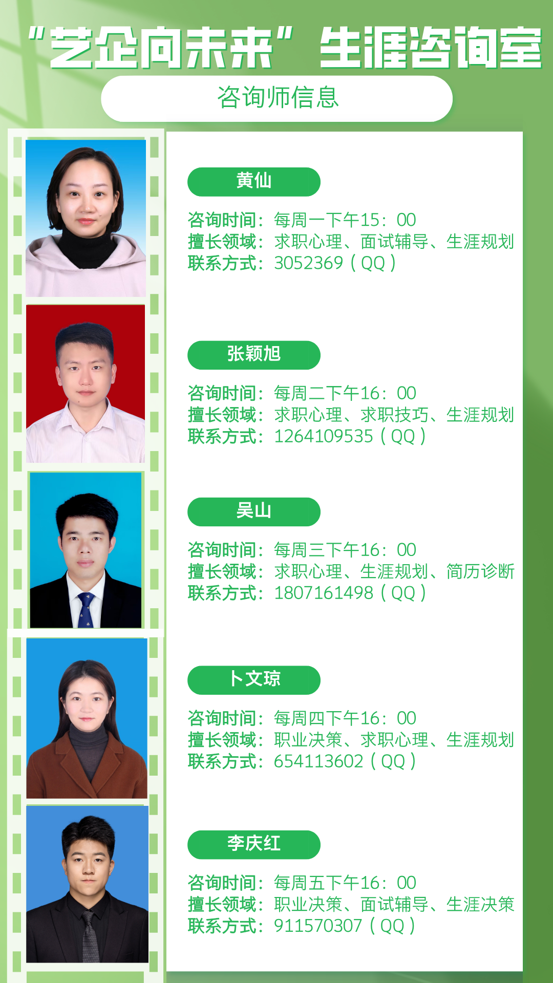 各咨询师的擅长方向及联系方式详见下方图示,欢迎大家根据自身需求精准预约。