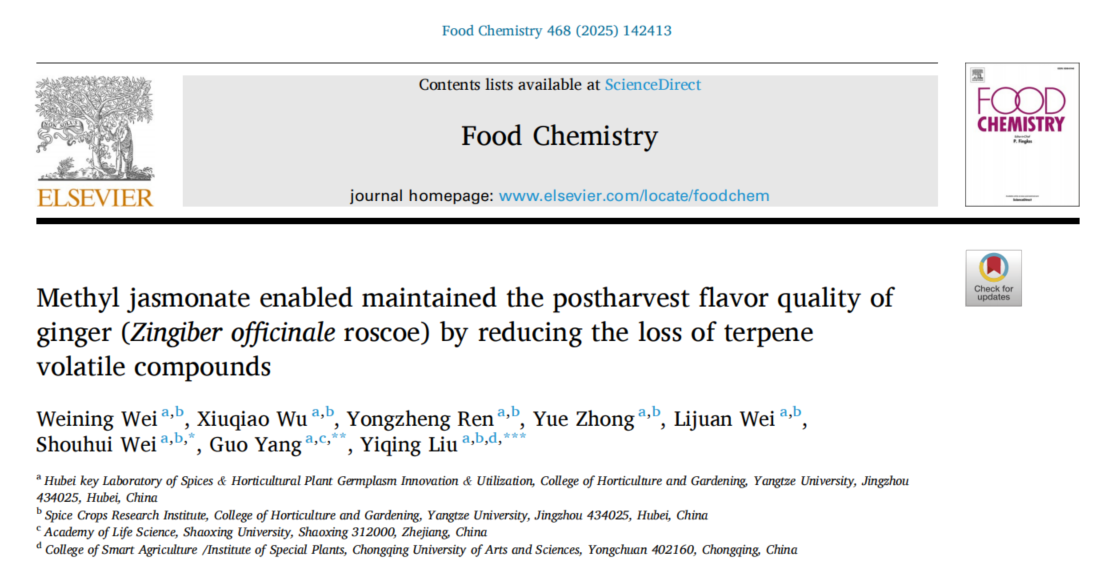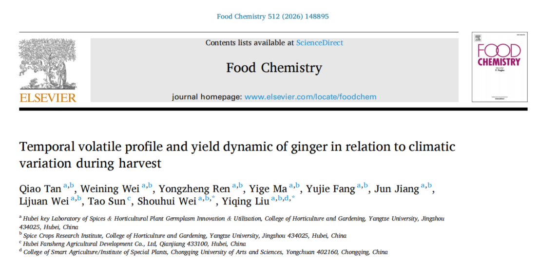 (通讯员:魏守辉)近日,公司香辛作物创新团队在国际知名期刊《Food Chemistry》(中科院一区TOP,IF=9.8)上发表题为“Temporal volatile profile and yield dynamic of ginger in relation to climatic variation during harvest”的研究论文。该研究系统揭示了生姜采收期香气风味物质的动态变化规律及其与气候因子的关联机制,为生姜优质高产采收期的科学确定提供了重要理论依据。