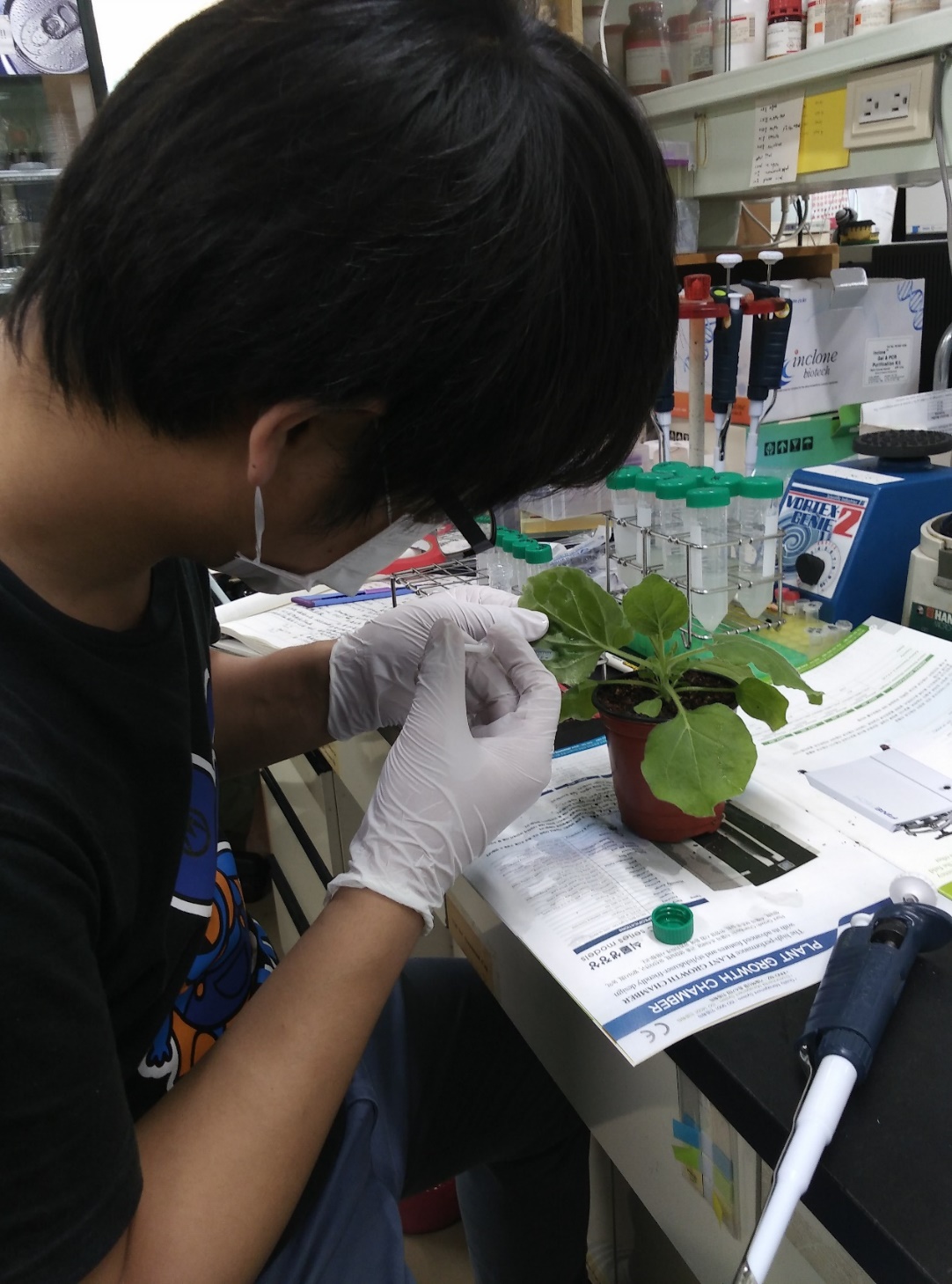 叶家保在韩国首尔大学农业与生命科学公司做烟草叶片瞬时表达转基因实验。中国青年网通讯员 叶家保 提供