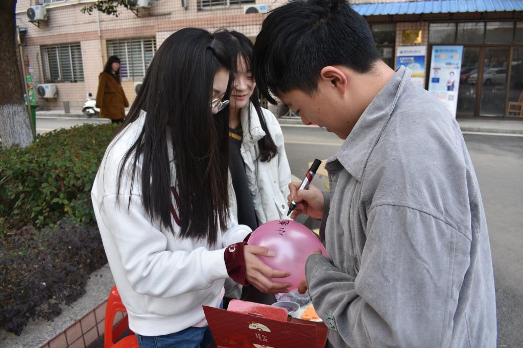 另一个与“你的心愿我来圆”同时进行的“只想对你说”环节中,男生们在主办方事先准备好的气球上写下自己心中对女生的美好祝愿,这些带有祝福的气球再由主办方随机送给前来参加活动的女生。收到气球的女生都表示很惊喜。