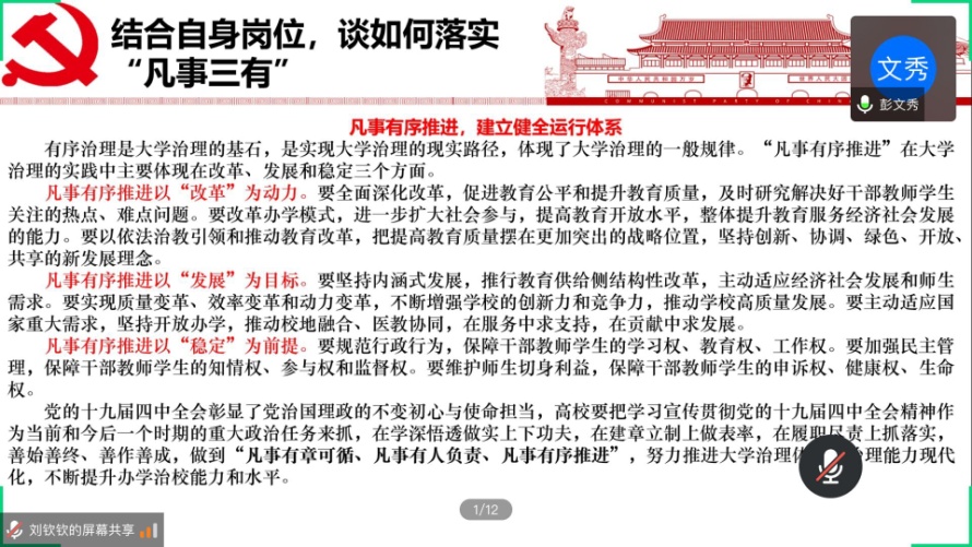 会议最后一项结合冯征董事长对于如何将“凡事三有”推进大学治理现代化的文章进行学习,认识何为“凡事有章可循、凡事有人负责、凡事有序推进”。