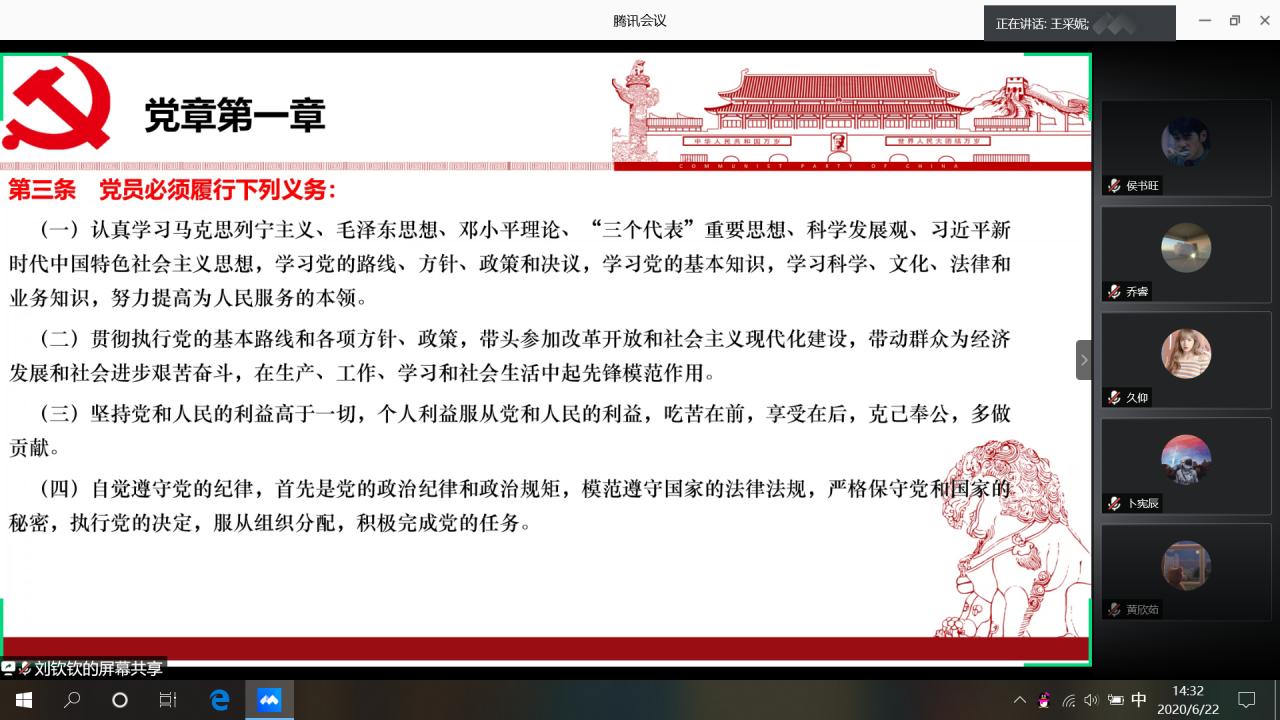 (通讯员:刘钦钦 王采妮)2020年6月22日下午2:30,beats365本科生党支部通过腾讯会议的方式开展六月主题党日活动,支部书记彭文秀出席了会议,全体党员准时到会,会议由刘钦钦和王采妮同志主持。