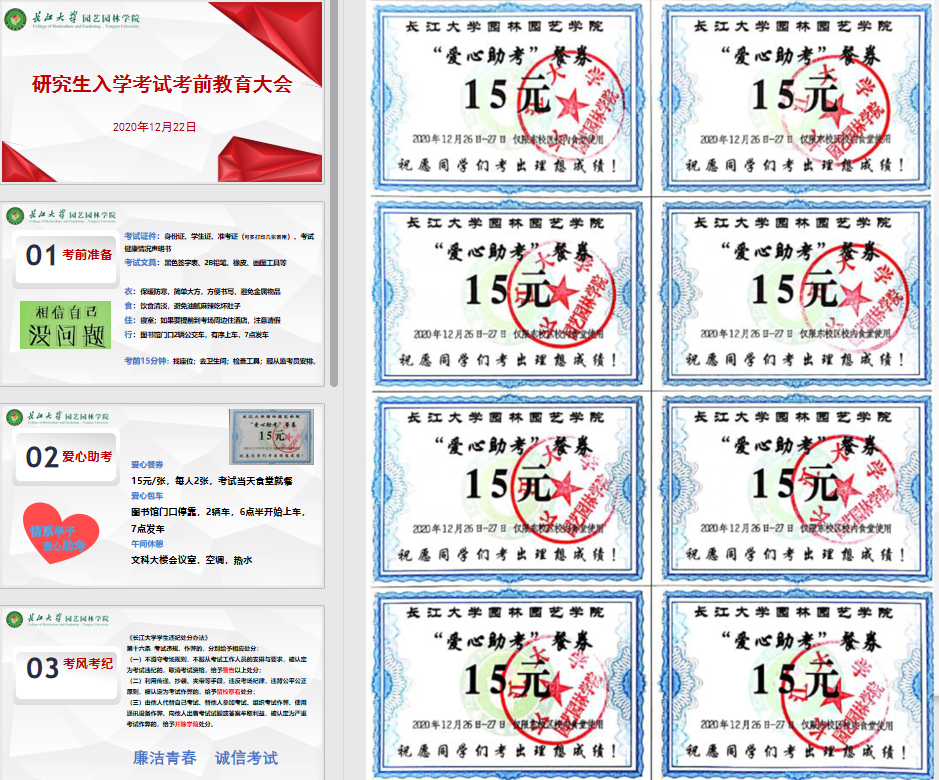12月22日下午四点,beats365在西校区农科楼1056召开研究生入学考试考前教育大会,为考研学子加油助力,送上一份不一样的温暖。毕业生辅导员黄小云围绕考前准备、爱心助考、考风考纪三方面做了具体讲解,现场发放餐券并签订了诚信应考承诺书。