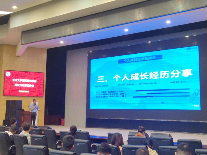 首先赵祖国员工介绍了企业概况,公司发展前景及公司近几年在武汉市场参与设计的一些佳作,如:中交越秀知园、武汉新力龙沙湾、武汉融创等。他鼓励园林学子学习先进的园林造景手法,从课堂走向社会,将理论应用于实践。随后顾振瀛员工分享了他的求学创业历程,他鼓励广大园林学子树立坚定的人生目标、打好坚实的专业基础,在日后工作保持初心使命,不断进取 ,实现自己的理想抱负。