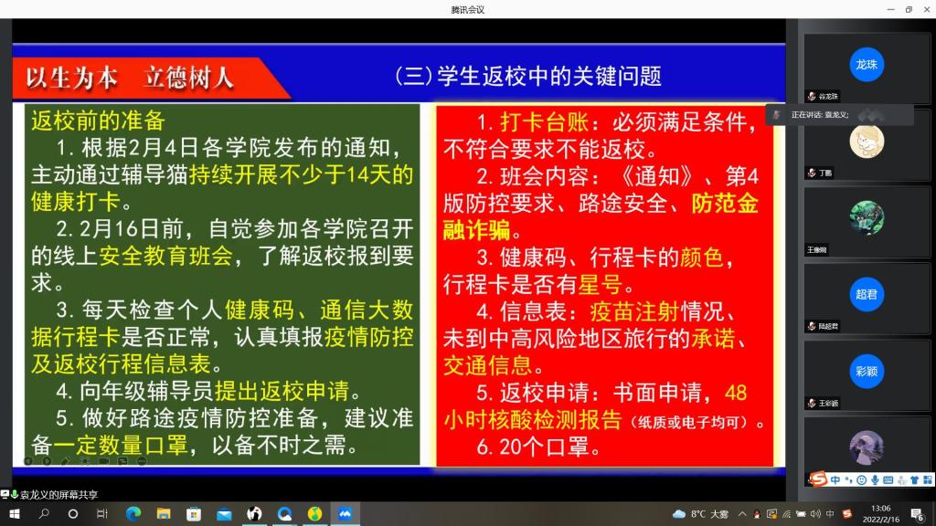 此次主题教育班会重点强调返校流程:先申请后到校、非批准不返校、异常情况暂缓返校。尤其是中高风险地区员工要暂缓到校,待该地区降为低风险地区后,凭健康绿码、通信大数据行程卡绿码以及48小时内核酸检测阴性结果申请返校。为确保员工能够按时返校,学校将根据疫情防控形势变化和校区所在地最新政策要求,适时调整员工返校办法。