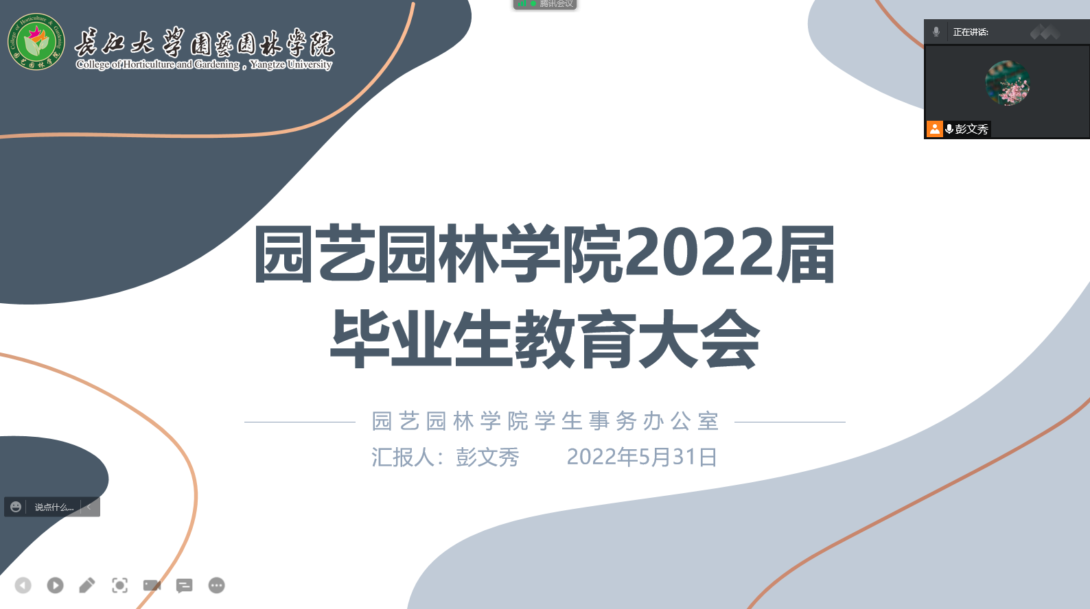 (通讯员:陈聪 彭文秀)为进一步落实国家疫情防控政策,落实落细公司疫情防控要求,结合当前毕业生安全离校、防溺水、诚信考试等相关安全教育要求。beats365于2022年5月31日12点30在腾讯会议召开2022届毕业生教育大会,会议由学工办主任彭文秀主持汇报,全体毕业年级研究生和本科生参会。
