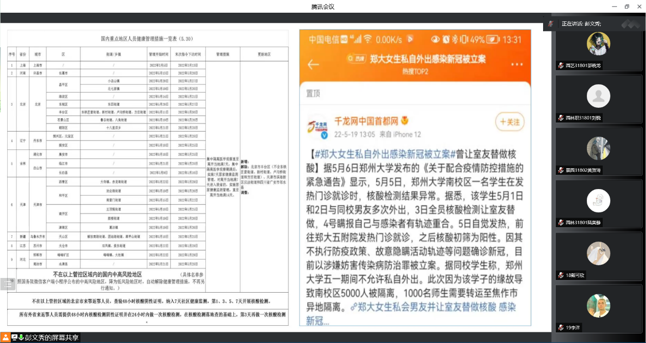 大会伊始,彭老师带领同学们学习近期教育部发布的疫情防控相关文件,进一步宣讲公司防控政策和要求,并通报其他高校员工违反疫情防控政策的严重后果,再次强调“非必要不出校、非批准不离校、非批准不返校”防控要求,并要求大家服从门岗管理,按时、按规定、按要求参加公司核酸检测抽检工作。让毕业生们清楚了解当前防控形势,配合管控要求,进一步做好疫情防护。