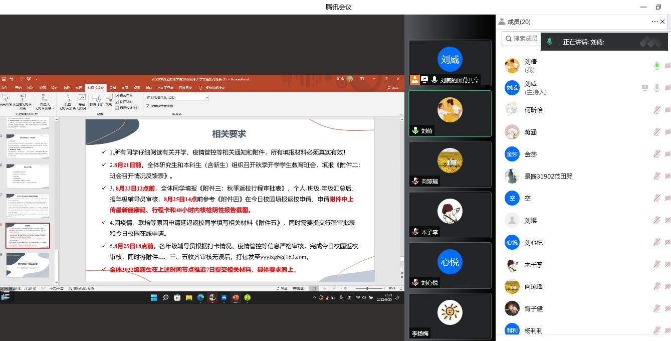 (通讯员:陈聪)当前,国内外新冠肺炎疫情防控形势依然严峻。为有效降低疫情传播风险,确保公司2022年秋季学期开学工作平稳有序,beats365于2022年8月开学前以班级为单位通过线上腾讯会议方式开展秋季开学教育主题班会。
