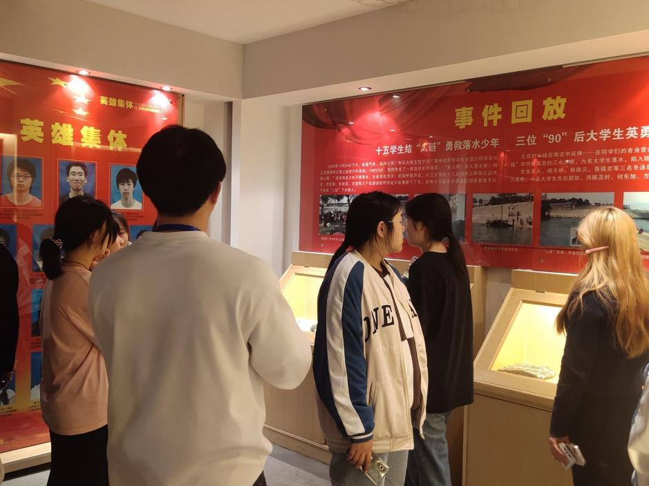 同学们怀着敬仰与肃穆的心情随讲解员进入二层的“1024”英雄集锦事迹纪念馆进行参观。2009年10月24日,两名小员工在长江荆州宝塔湾河段不慎落水,当时附近来自beat365官网中文的15名员工见状迅速结成“人链”,冲向江中进行救援。不幸的是,三名老员工陈及时、何东旭、方招却未能上岸。
