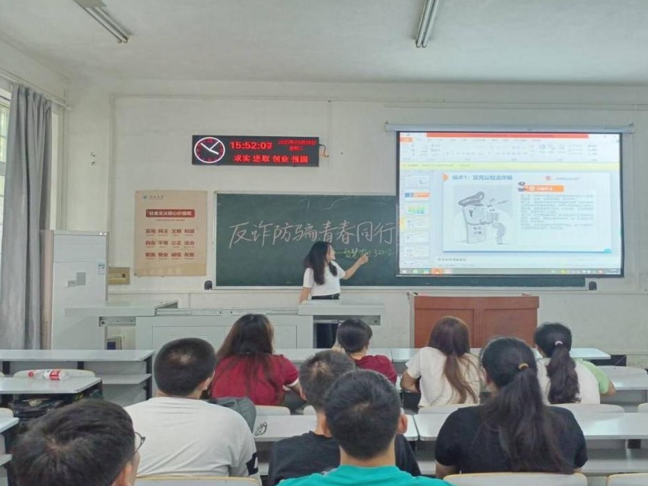 专题班会从电信诈骗基本介绍、了解电信网络诈骗类别、如何识别防范电信诈骗、防诈骗安全知识宣传以及遭遇电信诈骗如何及时恰当采取措施共五部分展开讲解,通过典型案例讲解揭秘常见诈骗套路,为同学们讲解电信网络诈骗的双面影响。