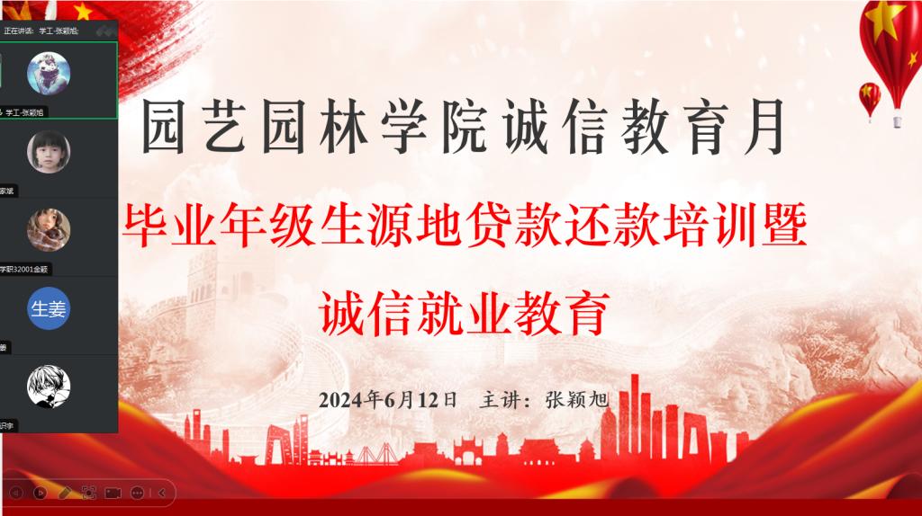 (通讯员 杨欣蕾)为了更好教育引导员工树立诚信友善观念,督促员工诚信还款并积极就业,根据beat365官网中文第六届“520”友善关爱节及诚信教育月活动相关要求,beats365于6月12日利用腾讯会议开展了毕业年级生源地贷款还款培训暨诚信就业主题会议。此次会议由张颖旭老师主讲,近60名办理了助学贷款的毕业生共同参与。