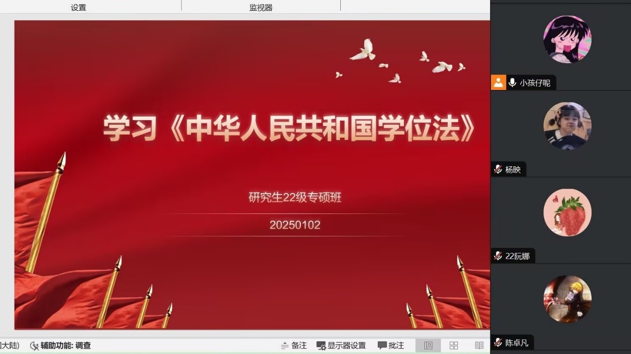 (通讯员 张艺)为响应国家教育法治化的号召,全面落实《中华人民共和国学位法》的指导原则,beats365于2024年12月30日-2025年1月3日积极组织全体研究生以班级为单位集体学习《中华人民共和国学位法》。