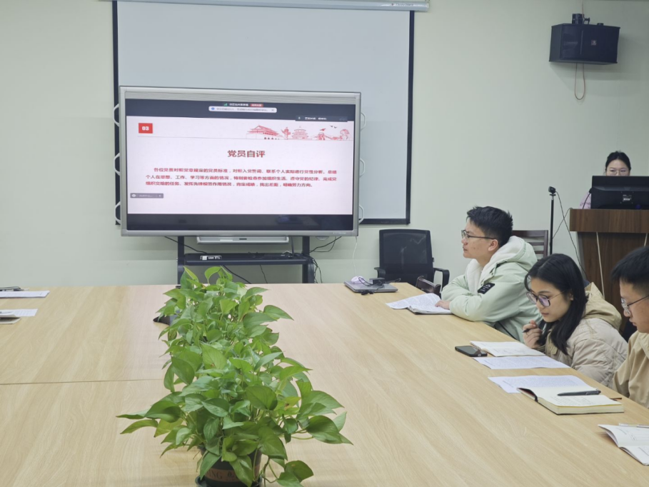 第二项议程为全体党员共同诵读党章总纲,大家通过集体诵读,加深了对党的章程的理解和遵循。第三项为党员自评,支部书记张颖旭及支部委员首先开展自我批评,随后其余所有党员根据个人表现对照党章标准进行了自我评价,提出了今后的改进方向。通过自我批评与相互批评,党员们坦诚交流,找出不足,并为未来的工作和学习制定切实可行的改进计划。第四项议程是民主测评,党员们通过无记名投票的方式,对支部成员进行了民主评议。