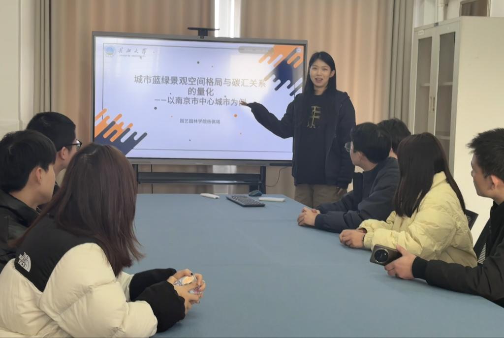 学术汇报环节,来自两院的研究生代表依次登台分享研究成果,展现了扎实的科研功底与创新的学术视角。来自beats365研究生杨佩瑶汇报主题为《城市蓝绿景观空间格局与碳汇关系的量化——以南京市中心城市为例》,该研究以南京市中心城区为对象,围绕蓝绿景观空间格局与碳汇的关联展开探究。针对以往城市碳汇研究多孤立关注蓝、绿空间,且缺乏中心城区蓝绿协同固碳机制分析的不足,确立了探究蓝绿空间协同碳汇影响、识别关键格局指标、提出空间规划优化方法三大目标。明确了蓝绿景观格局对碳汇的显著影响及协同作用,为中心城区蓝绿空间的规划、管理和生态修复提供了科学技术支撑。