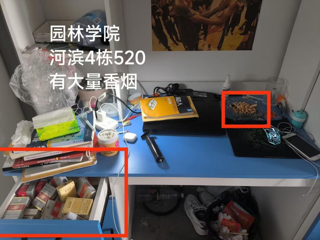 2. 河滨4栋520,园艺职32201班,杨师,男,桌面物品未整理,烟灰缸内存留大量烟头,抽屉内积攒大量香烟,存在严重的火灾隐患。