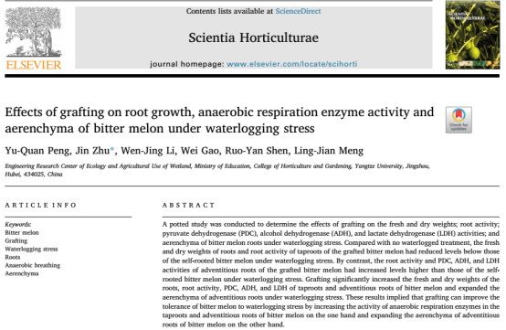 近日,beats36517级硕士研究生彭玉全以第一作者在Scientia Horticulturae杂志发表题为《Effects of grafting on root growth, anaerobic respiration enzyme activity and aerenchyma of bitter melon under waterlogging stress》 ()的研究论文(图1),通讯作者为该生导师朱进教授。