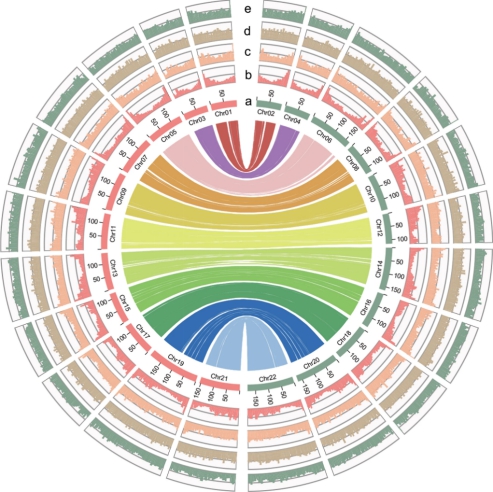 图1. 生姜基因组特征统计。a.染色体;b.基因密度;c.SSR密度;d.LTR密度;e.GC含量。