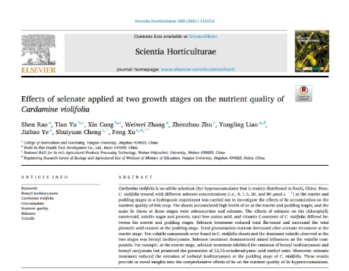 (通讯员 刘晓梦 桂嘉营)2021年6月,我中心2018级博士研究生饶申在国际权威杂志《Scientia Horticulturae》(园艺学2区,影响因子3.46)上发表了题为“Effects of selenate applied at two growth stages on the nutrient quality of Cardamine violifolia”的研究论文(图1)。饶申博士为论文第一作者,beats365许锋教授为通讯作者,beat365官网中文为第一署名单位。