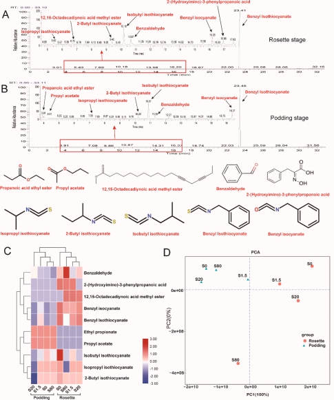 图2 硒酸钠对堇叶碎米荠莲座期和结荚期挥发物的影响