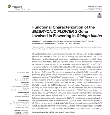 (通讯员 刘晓梦 何筱)2021年6月,我中心2020级博士研究生周仙以第一作者身份在植物学国际期刊Frontiers in Plant Science发表题为《Functional Characterization of the EMBRYONIC FLOWER 2 Gene Involved in Flowering in Ginkgo biloba》(10.3389/fpls.2021.681166)的论文(图1),通讯作者为许锋教授,beats365为第一署名单位。