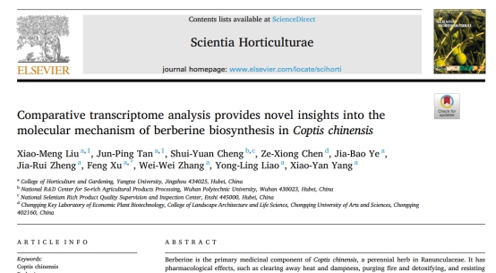今日,我中心2019级博士研究生刘晓梦在国际权威杂志《Scientia Horticulturae》(园艺学2区,影响因子3.463)上发表了题为Comparative transcriptome analysis provides novel insights into themolecular mechanism of berberine biosynthesis in Coptis chinensis”的研究论文。刘晓梦博士为论文第一作者,许锋教授为通讯作者,beat365官网中文为第一署名单位。