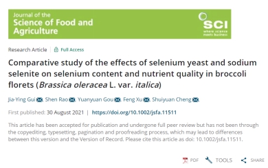 2021年9月,我中心2020级研究生桂嘉营以第一作者身份在国际著名权威杂志《Journal of the Science of Food and Agriculture》上发表了题为“Comparative study of the effects of selenium yeast and sodium selenite on selenium content and nutrient quality in broccoli florets (Brassica oleracea L. var. italica)”的研究论文。许锋教授为该论文通讯作者,beats365为第一署名单位。