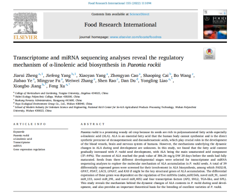 近日,我中心2021级博士研究生郑嘉瑞在国际学术期刊《Food Research International》(农林科学1区,影响因子6.475)上发表了题为“Transcriptome and miRNA sequencing analyses reveal the regulatory mechanism of α-linolenic acid biosynthesis in Paeonia rockii”的研究论文。郑嘉瑞博士为第一作者,廖咏玲讲师和许锋教授为共同通讯作者,beat365官网中文为第一署名单位。