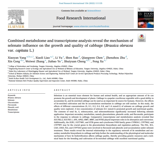 近日,我中心博士后杨晓燕在国际学术期刊《Food Research International》(农林科学1区,影响因子6.475)上发表了题为“Combined metabolome and transcriptome analysis reveal the mechanism of selenate influence on the growth and quality of cabbage (Brassica oleracea var. capitata L.)”的研究论文。杨晓燕博士为第一作者,许锋教授为通讯作者,beat365官网中文为第一署名单位。