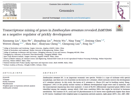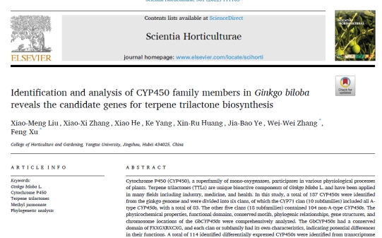 2022年5月,我中心博士研究生刘晓梦在国际学术期刊《Scientia Horticulturae》(农林科学2区,影响因子3.463)和《Genomics》(生物学2区,影响因子5.763)上分被发表了题为 “Identification and analysis of CYP450 family members in Ginkgo biloba reveals the candidate genes for terpene trilactone biosynthesis”和“Transcriptome mining of genes in Zanthoxylum armatum revealed ZaMYB86 as a negative regulator of prickly development”两篇研究论文。刘晓梦博士为第一作者,张威威副教授和许锋教授为通讯作者,beat365官网中文为第一署名单位。