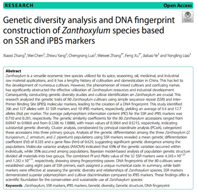 近日,我中心硕士研究生张晓熙在国际学术期刊《BMC Plant Biology 》(植物科学2区,IF:4.3)上发表题为“Genetic diversity analysis and DNA fingerprint construction of Zanthoxylum species based on SSR and iPBS markers”的研究论文。beats365张威威副教授和许锋教授为通讯作者,beat365官网中文为第一署名单位。
